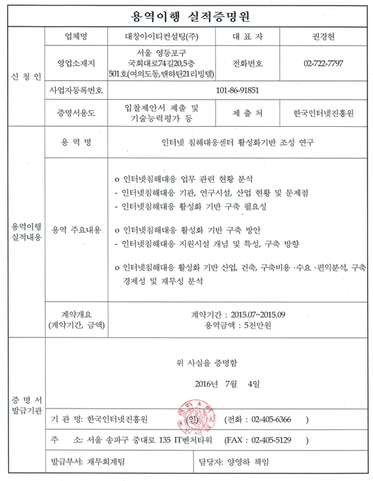 다양한 ICT사이버 침해 공격 관련 전방위 대비를 위한 안전시설구축 및 정보보호 산업의 사이버 방위산업을 육성하기 위한 원스톱 토털지원센터 구축과 예비타당성 조사연구를 통한 총 건립예산 확보용 기초자료로 활용 |